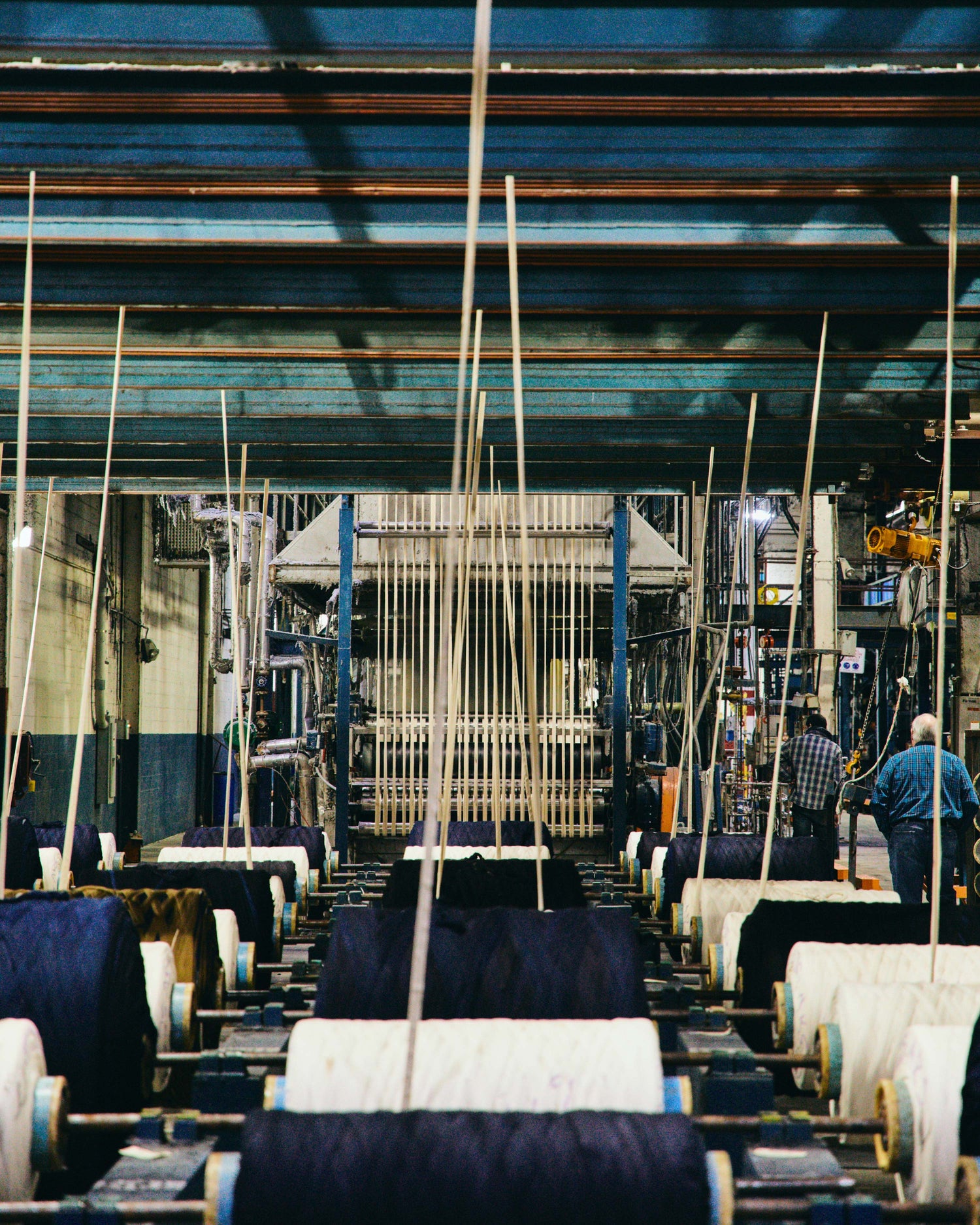 in order to avoid any cross-contamination, they stopped production at their dye range, cleaned the dye vats, and filled them with natural indigo from Stony Creek Colors -- then prepared our Cotton Project yarn for dying.